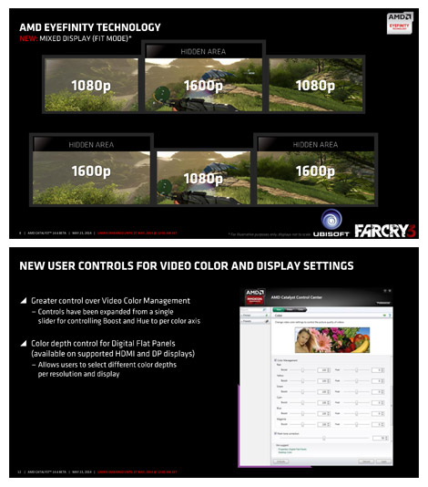 Mais les PC desktop profitent aussi d'une "petite" amélioration de Mantle avec le support des configurations multi-GPU CrossFire dans le jeu Thief. Le dernier patch de Thief est requis à cet effet. L'API Mantle et le CrossFire n'étaient disponibles qu'avec BF4 jusqu'à présent. Différentes optimisations pour la technologie Eyefinity Mais parmi les principales optimisations apportées à cette version 14.6, il ne faudrait surtout pas oublier la technologie multi-écrans Eyefinity sur laquelle AMD semble s'être particulièrement concentré. Tout d'abord, AMD annonce avoir complètement revu l'architecture logicielle de cette fonctionnalité ce qui autorise par exemple désormais l'utilisation d'écrans fonctionnant à des résolutions différentes ce qui était jusqu'ici impossible (mix de 1080p et 1600p par exemple). L'utilisateur peut désormais simplement choisir comment est générée la surface d'affichage : mode Fill optimal pour les écrans identiques, mode Fit pour utiliser la plus grande zone rectangulaire complète de chaque écran (bande noire en haut des plus grands écrans) ou mode Expand pour conserver la zone d'affichage maximale sur les plus grands écrans (mais perte d'affichage sur les plus petits). Une fonction de contrôle de l'alignement des écrans adjacents fait également son apparition. Enfin, il est possible d'appliquer en un clic une disposition d'écran particulière. A noter également de nouveaux réglages pour les couleurs et l'affichage. La profondeur des couleurs peut par exemple être réglée indépendamment pour chaque écran HDMI ou DisplayPort. Décodage matériel des images JPEG Cela en fera peut-être sourire certains mais AMD annonce que ces drivers Catalyst 14.6 prennent en charge l'accélération matérielle du décodage des images JPEG. Cela concerne les APU Athlon (5150/5350) et Sempron (2650/3850) de la famille Kabini basés sur le socket AM1. La simple ouverture d'un fichier JPEG devrait donc être plus rapide sur ces plateformanes d'entrée de gamme même si on peut penser que cela ne doit être visible que sur de très lourds fichiers. AMD précise également que cette prise en charge matérielle permet de réduire la consommation énergétique de la décompression JPEG. Là encore on peut s'interroger sur l'intérêt de la chose puisque le socket AM1 est une plateforme desktop... Une dernière précision, les APU AMD A10 supportent également le décodage du JPEG depuis les Catalyst 14.1. Windows 8 n'est plus pris en charge pour le moment Passons maintenant à la "mauvaise" nouvelle si l'on peut dire. Le système d'exploitation Windows 8 n'est tout simplement pas supporté par ces drivers. Ce pack Catalyst 14.6 n'intègre en effet que le pilote WDDM 1.1 pour Windows 7 et le pilote WDDM 1.3 pour Windows 8.1. Le système Windows 8.0, seulement sorti en 2012 passe déjà à la trappe ! Certes, la mise à jour de Windows 8 vers 8.1 est gratuite mais il nous semble cela dit un peu rapide pour une marque comme AMD de mettre déjà celui-ci au placard sans compter que Microsoft ne vas pas arrêter son support avant fin 2015... Si vous n'êtes pas encore passé à Windows 8.1 (ou 2012 R2), AMD annonce toutefois qu'une future version des Catalyst pour Windows 7 fonctionnera également avec Windows 8 mais donc seulement avec un pilote de type WDDM 1.1. C'est un moindre mal mais ces utilisateurs perdront donc les bénéficies du modèle de pilotes WDDM 1.2 spécifique à Windows 8. C'est un sacré retour en arrière assez difficile à comprendre. AMD doit vraiment avoir d'importantes difficultés financières pour tomber si bas et chercher à gagner des cacahuètes de cette façon. Les Catalyst 14.4 resteront donc les derniers drivers WDDM 1.2 chez AMD. Et pendant ce temps, de nouveaux drivers Catalyst ont encore été publiés pour XP il y a quelques jours. Les drivers chipset de retour Comme nous vous l'avions expliqué, les Catalyst 14.4 WHQL contenaient aussi bien les drivers graphiques pour APU/GPU Radeon que les drivers pour les chipsets AMD (APU et southbridges). Hélas, AMD était vite revenu en arrière et avait retiré ces derniers du pack 14.4 au bout de quelques jours à cause d'un bug avec le pilote SATA AHCI. Avec ces Catalyst 14.6 beta, les drivers pour chipsets (SATA AHCI, SATA RAID, USB, SMBus...) font leur retour. Espérons que les choses soient au point cette fois-ci. Téléchargement des drivers AMD Catalyst 14.6 beta 1.0 Ces drivers sont unifiés pour tous les GPU desktop et Mobility des séries Radeon HD 5000, 6000, 7000, 8000 et R-200. Actualité publiée par Julien Sambourg le mardi 27 mai 2014 à 23:13